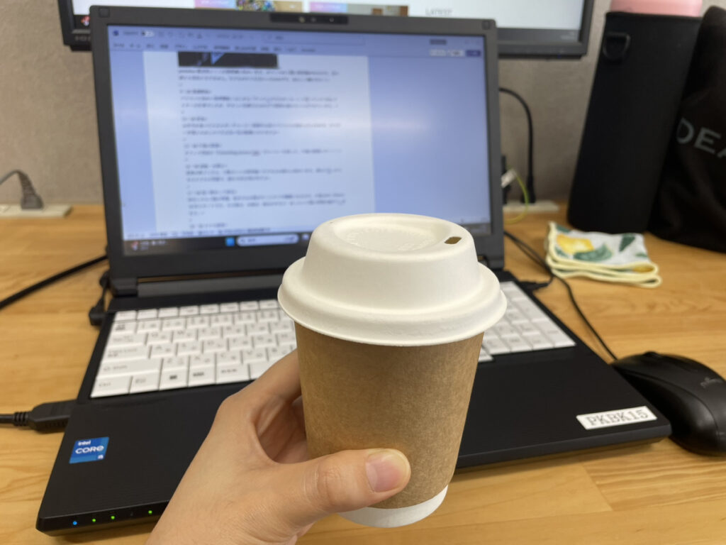 オフィス併設の「Coworking terrace i.lab」でコーヒーを買って、午後の業務スタート!