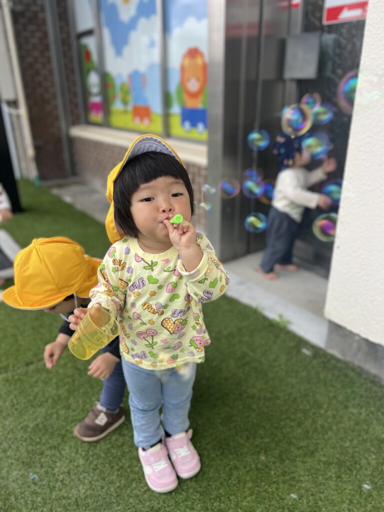 しゃぼん玉遊びは、飛んでいくしゃぼん玉を見る追視をはじめ、口元や手元の発達に効果がある遊びです。ひたすら「ふ~」と吹き続ける園児がいたり、しゃぼん玉を割るのが楽しい園児がいたり、遊び方はさまざま。