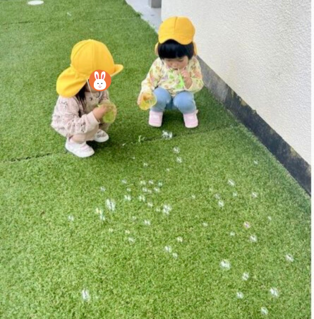 湿度が高い日や雨の翌日は、しゃぼん玉が割れにくいのだとか。地面にたくさんしゃぼん玉を吹いて、ふみふみして壊す遊びを楽しんでいるようです。