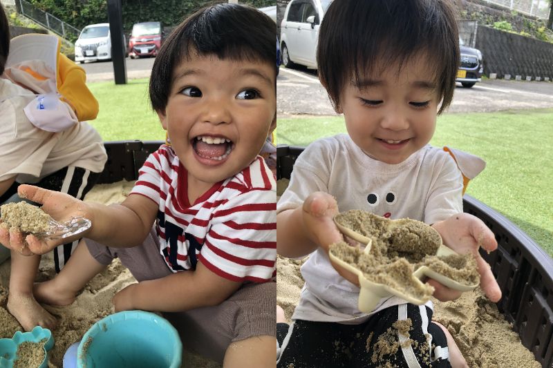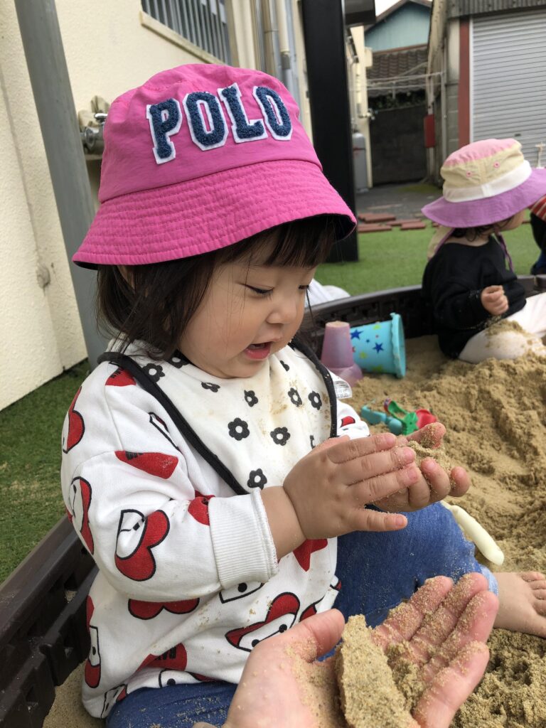 園児のほうから「砂場にいきたーい!」と言うこともあるくらい、砂場遊びが好きなようです。砂場遊びは、手先の発達や創造力、お友達とのコミュニケーション能力などが育まれる遊びです。0歳児クラスの園児は、砂に触れることからスタートして感触を楽しみます。
